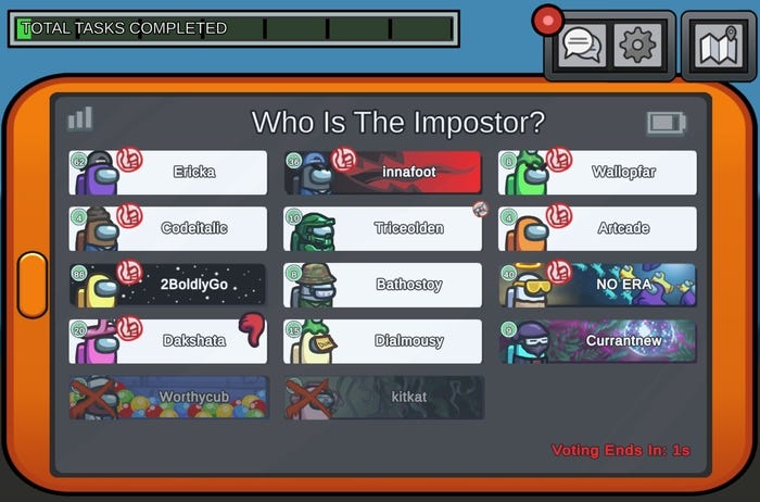 The Impostor will soon begin to attack, and the remaining players must call an emergency meeting to vote on the suspected culprit. The one with the most votes is ejected into the void of space.