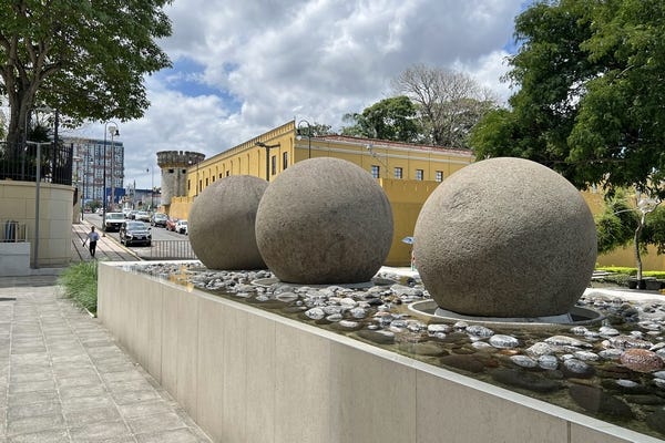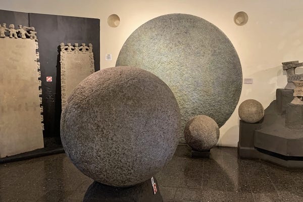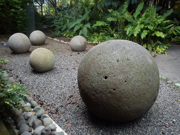 I learned while writing this episode that there’s a word, “petrosphere.” I have rarely found such a gulf between the elegance of a word and the banality of its meaning. As you can imagine, petrosphere means “stone ball.” Luckily, the Diquís spheres of Costa Rica are anything but banal. There are more than three hundred of them, in different sizes and weights: from the small ones to those that reach fifteen tons. The dating is murky: the widest range goes from 300 CE to 1500 CE, and because many were moved from their original sites it’s hard to be more precise. There are even carbon-14 assessments that place them millennia earlier. The scientific community is blunt about this. If you ask “When were the Diquís spheres carved?” the unanimous answer is: “Who knows.”