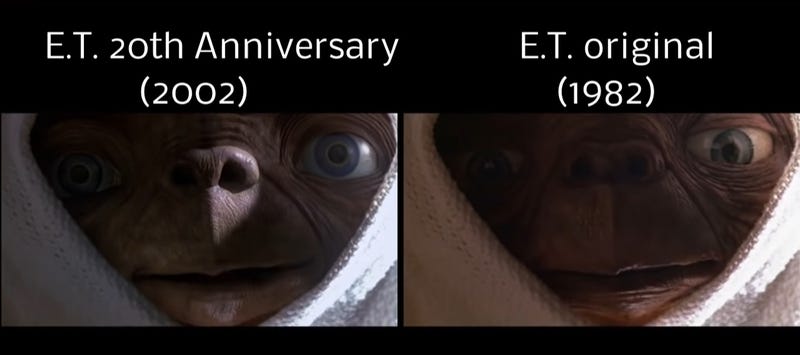 The film’s own 20th-anniversary edition (just like Another World—fancy that) came with heavy touch-ups. Among other tweaks, the cops’ shotguns turned into walkie-talkies and E.T. got a digital nose job—see below: