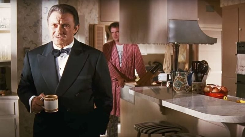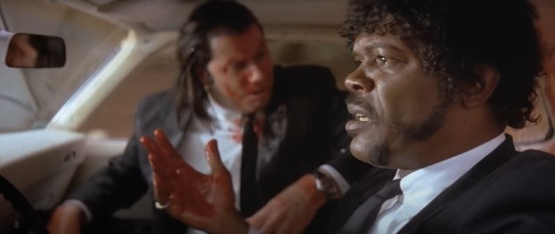 Panicking, Vincent and Jules (Samuel L. Jackson) rush over to Jimmie’s place (played by Quentin Tarantino himself, in one of his trademark cameos), where they argue, unsure of how to handle the situation.