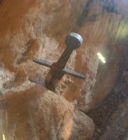 How many swords stuck in rocks exist? More than you might think. In Italy, for example, more precisely in Tuscany, on a small hill near the Abbey of San Galgano—famous for being very photogenic (see the photo above)—stands the Hermitage of Montesiepi. Inside the chapel, there is a sword in the stone. Actually, two.