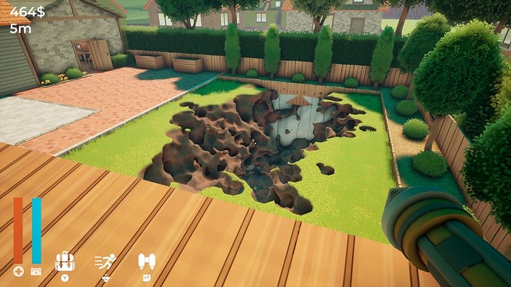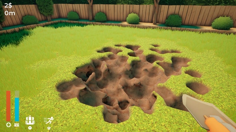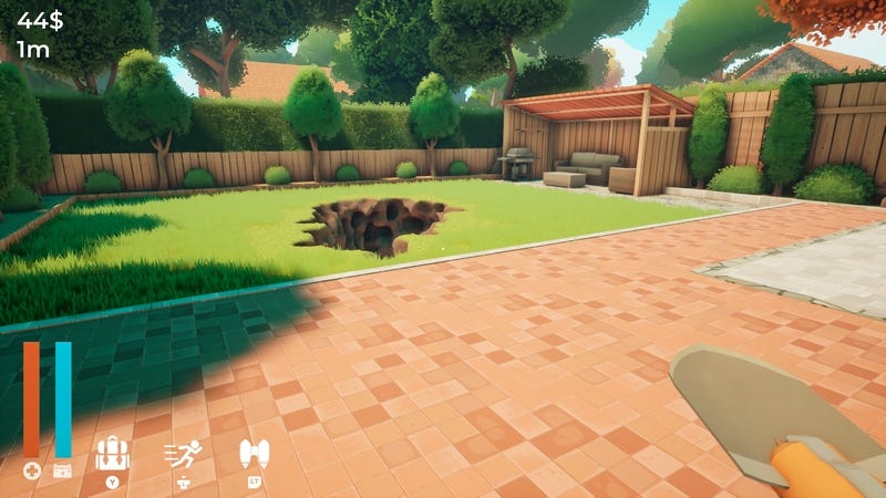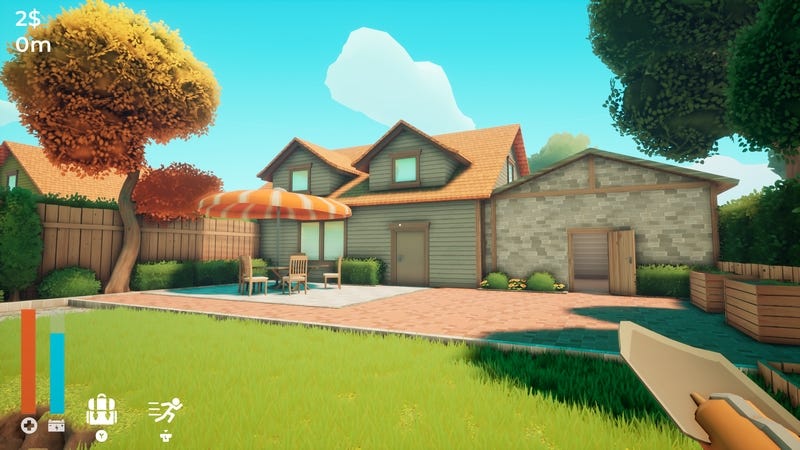 Not a bad little house. And in the yard there’s an X drawn on the grass. Armed with a strange motorized shovel (included with the house), we start digging.