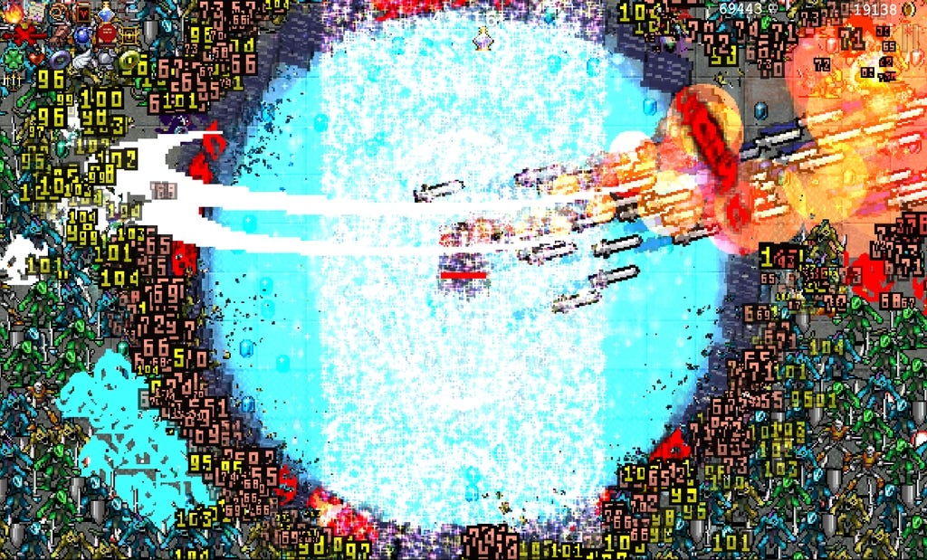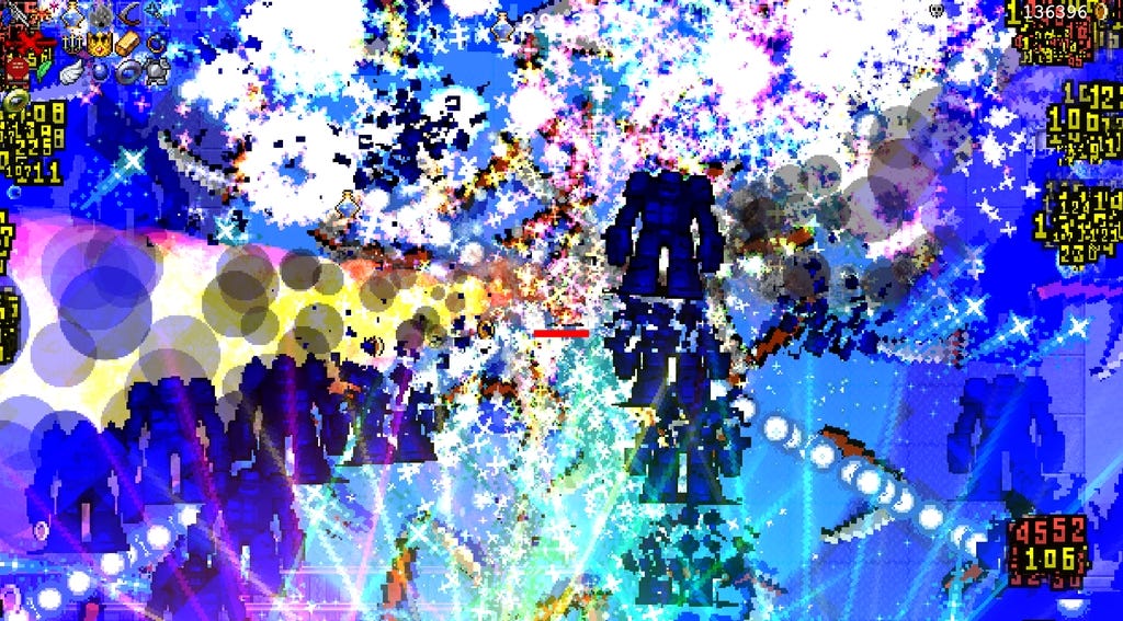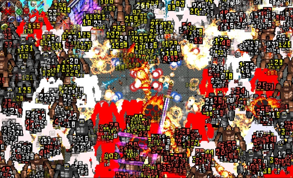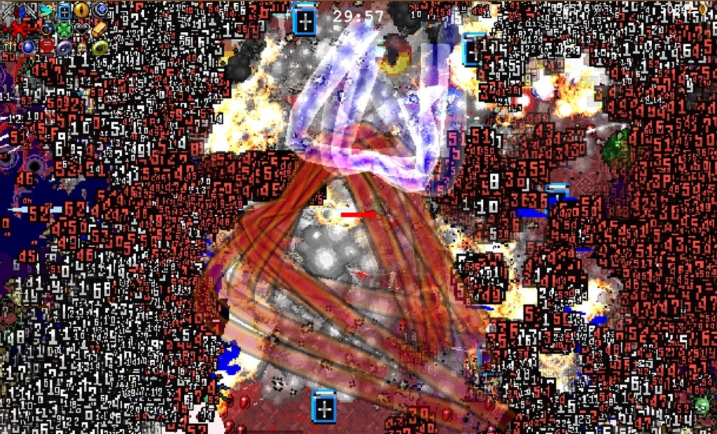 Once you get past twenty, thirty minutes, the same thing happens that you get in front of a Pollock: chaos takes over the canvas. The protagonist is buried under an avalanche of damage numbers, enemies stop being individuals and turn into patterns, effects close every gap. The character you are steering becomes less important and the weapons spin around you like layers of enamel paint.