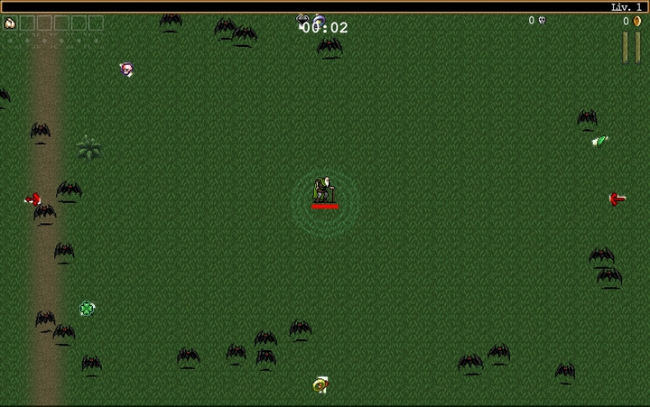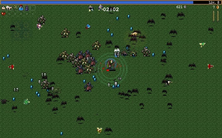 Look at the empty screen at the beginning of a Vampire Survivors run. Flat green, a few bats, a couple of things on the ground. It looks like the base layer of a Nineties JRPG left halfway through production. In the middle there is a tiny little guy who basically does nothing except walk. It is the phase where the game makes you feel like a hopeless nobody at the center of a gigantic field, when in reality you are a still-sealed can of paint.