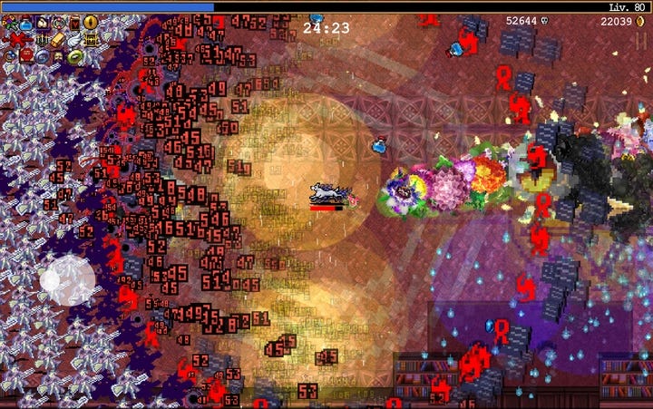 Vampire Survivors is, in practice, a generator of fleeting abstract paintings. Every run is a half-hour performance where your minimal input (moving a character) gets amplified by a cascade of visual consequences. Only two things can happen during a run: you die, as per contract, or you end up creating your own personal Pollock. Once you reach that level the game almost stops existing. You stand still and stop touching anything. The same effect as a Pollock painting that has reached its perfect cooking point. Chaos has taken shape and there is nothing left for us to do except watch.