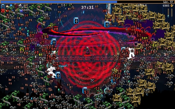 It’s incredible that someone managed to achieve that with a video game, a medium built around action and interaction more than any other. Yet that’s exactly what happens. At its peak, in Vampire Survivors you stop playing. If that’s not magic, what is?