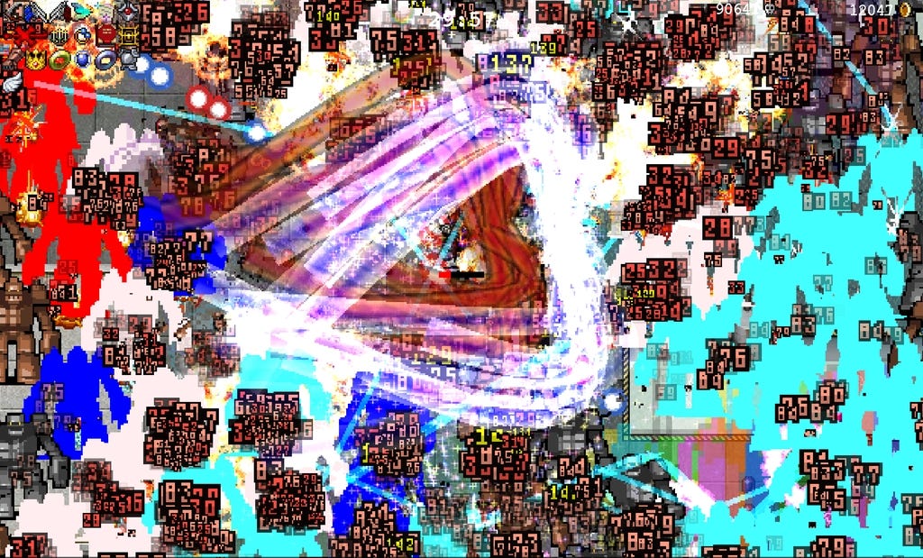 The interesting thing is that none of this is actually random. Under the visual storm there is a very precise machine: probability tables, spawn patterns, synergies between items. If you repeat the same build and move roughly the same way, the screen will produce a composition similar to the previous run. Change a single upgrade and suddenly the rhythm of the numbers, the dominant colors, even the shape of the enemy masses changes. It is exactly the logic of Pollock’s paintings: behind the chaos there is a regularity that your brain recognizes even if it doesn’t really understand it.