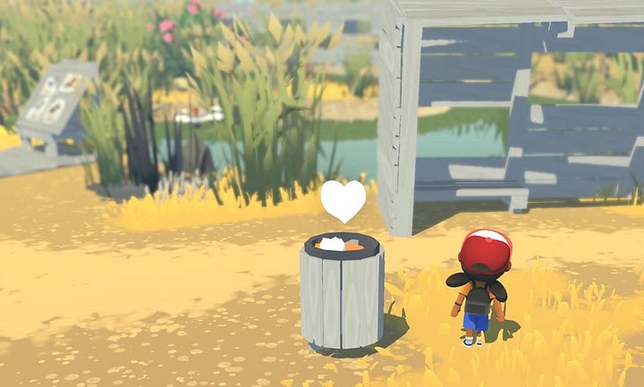 Over the seven days of vacation, we won’t roam the island just to take photos. There’s another gesture we’ll find ourselves doing often, a small gesture that still matters: picking up trash. Apparently even video games have their local litterbugs, and we’ll be the island’s superhero, ready to pounce on every disgusting thing people leave behind. And if the idea of cleaning up Secarral isn’t enough for you, know that every time you toss a piece of trash in a bin, the game gives you a little heart: instant moral approval.